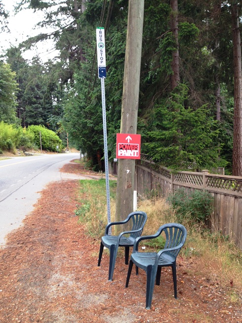 The Daily EO: September 11th, 2013 On a run this summer, came across this bus stop in Sechelt: September 11th, 2013 Extra-Ordinary: Nobody steals the chairs. (sorry for the lack of picture quality, but I had been running and was shaky and the phone was probably sweaty too) Share this: Click to share on X (Opens in new window) X Click to share on Facebook (Opens in new window) Facebook Like Loading... Related Author: Susan Susan has a lot to say about a lot of things. View all posts by Susan