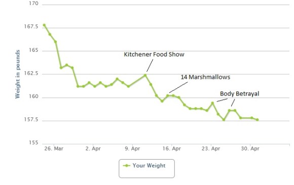 It was 5 weeks ago that I decided that I needed to deal with my Shrunken Shorts Syndrome and my husband needed to look at his Ski Jump Shirt diagnosis. We committed ourselves to a month of exercise, healthy restricted calories and a 5K race at the end of it. I’ll admit, we cheated a bit – we started in the last week of March. We did consider having a binge instead, but we thought it would be too hard of a transition – and my pants were already too tight. It became a common sight to see me in workout clothes and weighting out food on our scale.