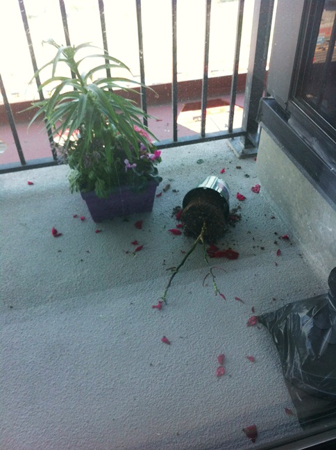 Emile noticed the plants getting a little peaky, so decided to put them out on our balcony for a little direct sunlight and fresh air. The birds – crushed during aforementioned Epic Bird Battle – decided this was their opportunity to exact revenge for the humiliating loss.