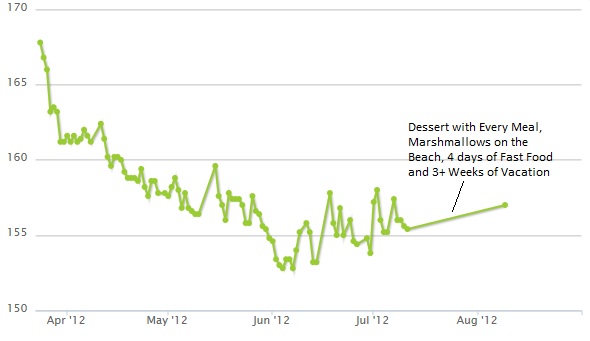 All during my vacation I ran every 2nd day as a minimum, and I felt pretty good about that. My diet was pretty good but there were significantly more carbohydrates than I usually eat, more diet root beer and definitely more desserts. But I didn’t weigh myself for the time I was away. I didn’t really want to know because I assumed it just creeping up every day.